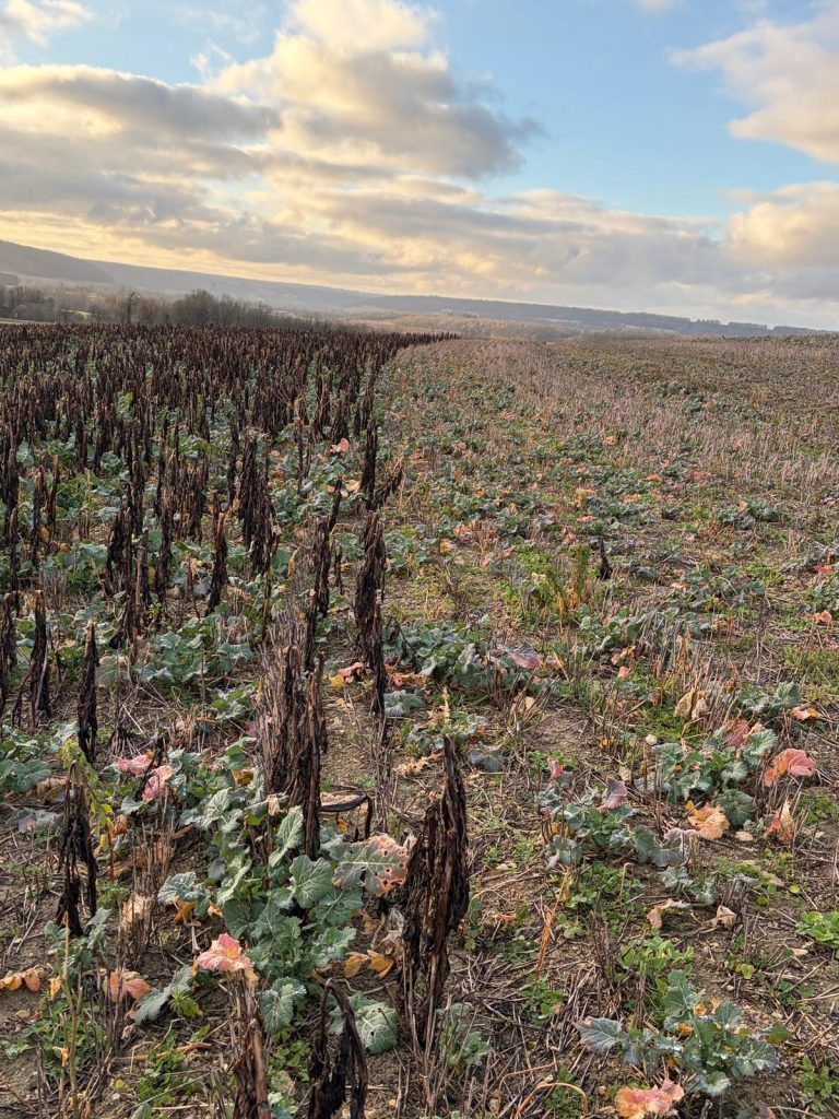 Preuve à l’appui avec cet essai réalisé cet automne par Fabrice et Thibault Lugnier à Rimaucourt (52). Dans un sol très argileux et humide, un colza associé avec du fenugrec, de la minette et du trèfle violet a été semé début août, avec ou sans ajout de féverole de printemps.
